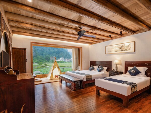 Erleben Sie die Höhepunkte des Li-Flusses an Bord eines komfortablen 4-Sterne-Schiffes. Während die ikonischen Karstfelsen an Ihnen vorbeiziehen, entdecken Sie unter anderem das Motiv der 20-Yuan-Banknote. Nach der Ankunft in Yangshuo können Sie in einem handverlesenen Boutique-Hotel die Seele baumeln lassen – eine Oase der Ruhe, eingebettet in die spektakuläre Bergkulisse.